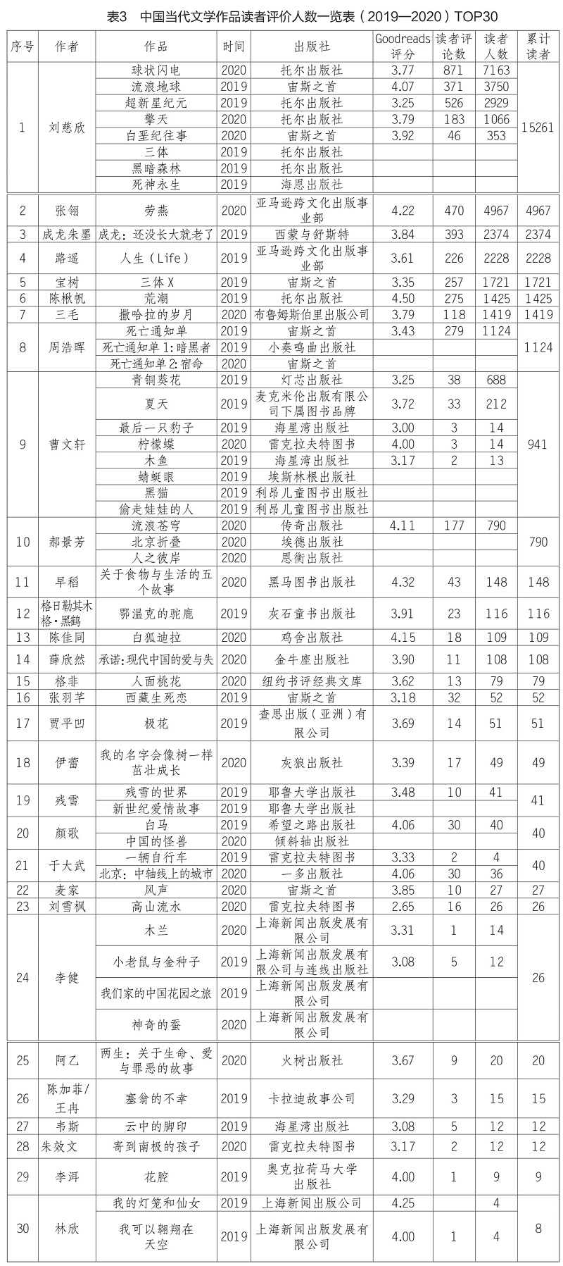評估研究的海外館藏基礎(chǔ)數(shù)據(jù)來源于OCLC(Online Computer Library Center)的World Cat世界圖書館聯(lián)機(jī)書目數(shù)據(jù)庫,并輔以日本CINII數(shù)據(jù)庫與JSTOR電子書數(shù)據(jù)庫的書目數(shù)據(jù),彌補(bǔ)OCLC數(shù)據(jù)偏重歐洲、北美地區(qū)的不足。以“translated from Chinese”為關(guān)鍵詞進(jìn)行檢索,時間限定為“2019—2020”,以海外館藏超過3家為參考標(biāo)準(zhǔn),遴選了96部中國當(dāng)代文學(xué)作品,參見表1 TOP30排行榜。媒體評價數(shù)據(jù)來源于世界主要媒體數(shù)據(jù)庫和道瓊斯媒體數(shù)據(jù)庫,時間限度為2019至2020年,參見表2。TOP20排行榜。讀者評價數(shù)據(jù)依托于亞馬遜網(wǎng)與Goodreads平臺,時間限度為2019至2020年,詳情見表3 TOP30排行榜。