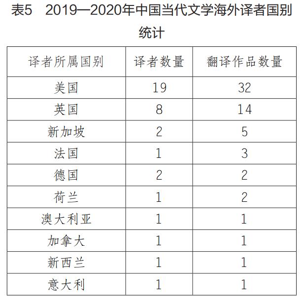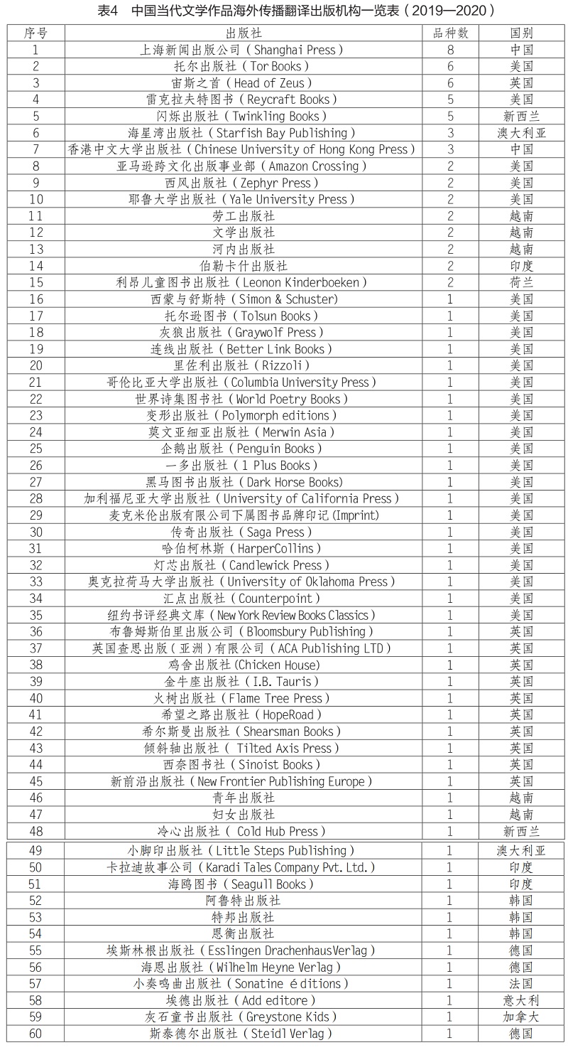 文本的對外翻譯依舊是中國當(dāng)代文學(xué)海外傳播的核心與關(guān)鍵。通過本次研究發(fā)現(xiàn),中國當(dāng)代文學(xué)作品的譯介模式,已經(jīng)從零散、個體的譯介向中外聯(lián)合的機(jī)制化、組織化譯介模式轉(zhuǎn)變。這也是一個非常重要的變化。中國當(dāng)代文學(xué)作品的對外翻譯與介紹,一直是由少數(shù)漢學(xué)家、中國當(dāng)代文學(xué)研究專家的個人學(xué)術(shù)興趣所主導(dǎo),因而中國當(dāng)代文學(xué)的對外譯介長期處于零散、偶發(fā)、不系統(tǒng)的狀態(tài)。2019—2020年度的數(shù)據(jù)顯示,這種譯介狀態(tài)正在發(fā)生轉(zhuǎn)變,由中國大陸出版機(jī)構(gòu)、中介服務(wù)機(jī)構(gòu)所進(jìn)行的組織化、機(jī)制化翻譯模式已經(jīng)逐漸形成。