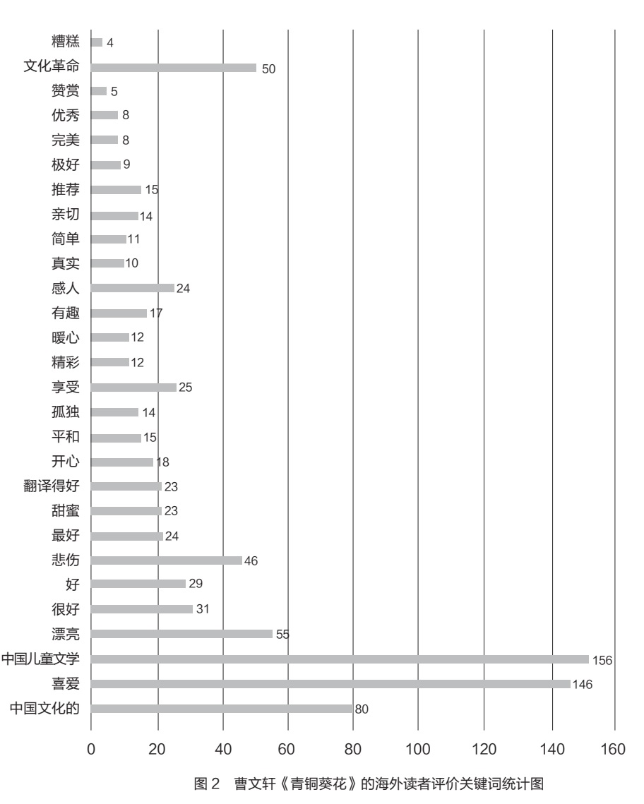 此外,在兒童文學(xué)領(lǐng)域中,曹文軒的8部上榜作品,累計讀者941人次,排在該領(lǐng)域首位。以其中名氣最高、閱讀人數(shù)最多的作品《青銅葵花》為例。截至2021年8月,曹文軒的《青銅葵花》在Goodreads上的評分達(dá)到4.1分,參與打分的人數(shù)近千人,讀者評論數(shù)180條,其中評論字?jǐn)?shù)超過100個詞的達(dá)到近100條,超過500個詞的有10條,3條評論超過1000個詞。2021年8月通過關(guān)鍵詞詞頻統(tǒng)計發(fā)現(xiàn):156名讀者留言中提到了“中國兒童文學(xué)”,其中“喜愛”頻次為146次,“中國文化的”為80次,可以想見,海外讀者對于《青銅葵花》的接受態(tài)度是相當(dāng)高的。詳情見圖2??傊?,無論是以《三體》為代表的中國科幻文學(xué),還是以《青銅葵花》為代表的中國兒童文學(xué),都已經(jīng)在進(jìn)入世界主流文壇且受到讀者廣泛關(guān)注,中國當(dāng)代文學(xué)的海外傳播取得了一定的成績。