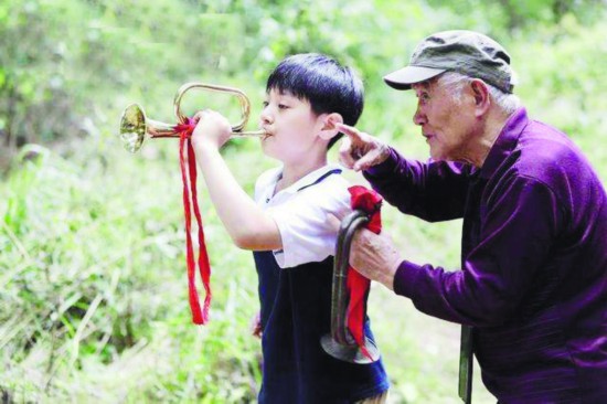 首先,影片建構(gòu)了一個歷史與現(xiàn)實(shí)相互鏈接,祖輩與孫輩思想、情感傳承并相互認(rèn)同的獨(dú)特?cái)⑹驴臻g和人物關(guān)系鏈條。導(dǎo)演選取這樣獨(dú)特的視角和題材,緊扣當(dāng)下城市孩子普遍缺乏體力、意志力鍛煉,并且較為任性、以自我為中心、缺乏集體協(xié)作感等現(xiàn)實(shí)問題,通過寓教于樂的方式使孩子們自然而然接受紅色革命歷史教育、傳承紅色基因。我們看到,影片為觀眾建構(gòu)了爺爺和孫子這一對特殊的人物關(guān)系,這種關(guān)系與紅色基因的傳承同聲相應(yīng),也在當(dāng)下主場景影像敘事中植入了歷史閃回的景觀敘事。由表演藝術(shù)家牛犇飾演的爺爺鄭紅兵,長期堅(jiān)持居住在山中老屋,他珍藏著那把父親傳承下來的老軍號,并向人們不斷講述過往的革命歷史,他對于老屋和老軍號的堅(jiān)守不乏象征意義。孫子與爺爺圍繞軍號展開故事沖突,孫子對于老軍號由不理解到理解,也是對爺爺由不理解到理解的思想、情感蛻變過程。