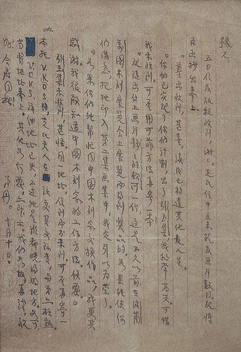 翻譯家、散文家、教育家曹靖華致魯迅信,寫于1934年10月10日。1927年起曹靖華在蘇聯(lián)任教,從1930年年初到1933年秋回國,四年中為魯迅搜集了蘇聯(lián)木刻家的木刻原拓一百余幅,魯迅把這些作品編成《引玉集》和《拈花集》。當時魯迅需要蘇聯(lián)木刻家的生平,曹靖華為之一一聯(lián)系,并由曹靖華翻譯后寄給魯迅?!兑窦酚?934年出版,此信所涉及的是《引玉集》出版后,魯迅將此書寄給蘇聯(lián)木刻家,加強中蘇木刻藝術(shù)交流,曹靖華為之進行翻譯和聯(lián)系的事。其中“克氏”指蘇聯(lián)木刻家克拉甫兼珂,“V.O.K.S.”是“蘇聯(lián)對外文化協(xié)會”的英文縮寫。