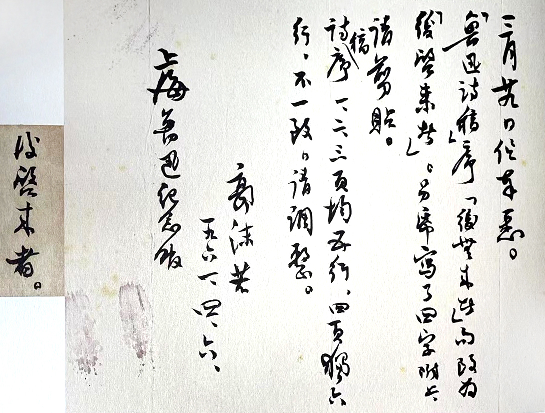 而文博大家鄭振鐸致施崇翔信件所關(guān)注的也是《魯迅全集》事宜。信中所寫:“即將“全集”掃數(shù)交還許先生發(fā)售……”。展覽中,另一件郭沫若的信寫于1961年,為郭沫若致上海魯迅紀念館,關(guān)于為上海魯迅紀念館編《魯迅詩稿》作序之事。