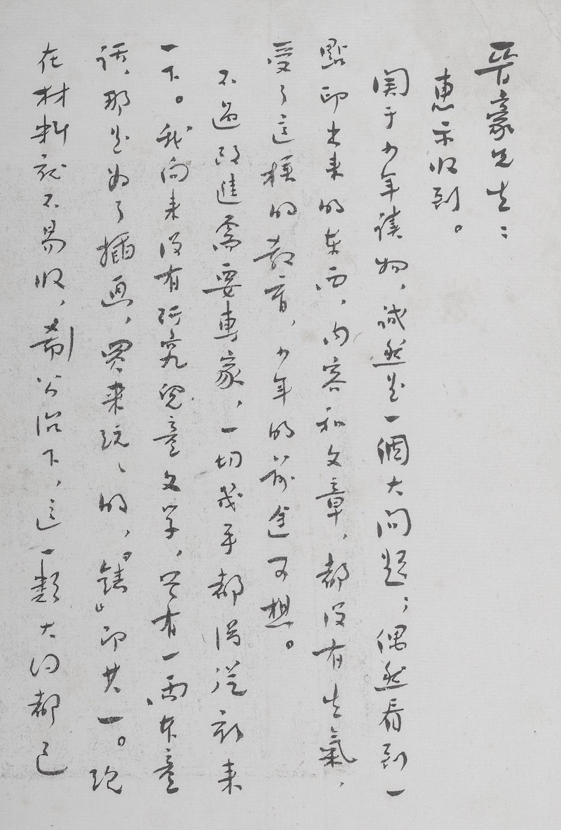 此外,展廳中也有魯迅本人的書信。其中,魯迅致楊晉豪信,寫于1936年3月11日。1936年楊晉豪任北新書局《小學生》半月刊編輯,楊晉豪致信魯迅,向魯迅約稿。魯迅于1936年3月11日復函楊晉豪,信中對于目前的少年讀物現(xiàn)狀表示擔心,并坦誠地說“我向來沒有研究兒童文學”,“相識的人里面,也沒有留心此道的人”,“曾有的一兩本童話,那是為了插畫,買來玩玩的”,“所以真是無能為力”,婉言謝絕楊晉豪的約稿。這體現(xiàn)了魯迅一貫的風格:自己沒有深入的了解,就不能誤人子弟。但他建議:“不過改進需要專家,一切幾乎都要得從新來一下?!?顯示了魯迅對中國兒童文學建設(shè)的關(guān)心和重視。