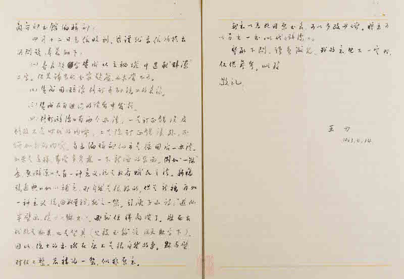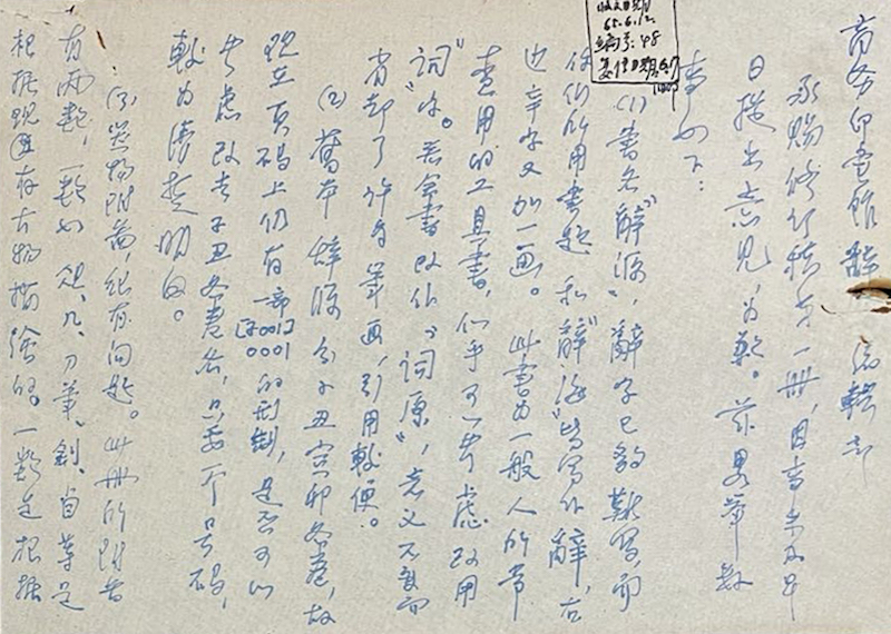 另一個小板塊是“《辭源》修訂”?!掇o源》是一部古漢語專門工具書,始編于1908年,續(xù)編于1931年。原有自然科學、社會科學和應用技術(shù)相關(guān)條目,有一定百科全書性質(zhì),第二版后刪去,成為專門語文工具書,1915年由商務印書館初版。新中國成立以后,1958年,《辭源》修訂工作開始。由于與《現(xiàn)代漢語詞典》《辭?!返姆止ぃ掇o源》由綜合性百科辭書,修訂為一部大型的古漢語辭書。商務印書館設(shè)置了“辭源組”,1964年,《辭源》修訂稿第一冊出版。在這一展柜,呈現(xiàn)了王力、陳夢家等人致商務印書館編輯部的信,探討《辭源》修訂相關(guān)問題。