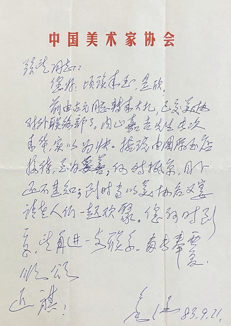 彥涵致張望信,寫于1983年9月21日。因為內(nèi)山嘉吉要來中國,張望請古元轉(zhuǎn)交信札給彥涵,告知相關(guān)事宜。此信是彥涵對張望來信的回復,并表示到時當以美協(xié)名義請老一輩的木刻家們一起歡聚。