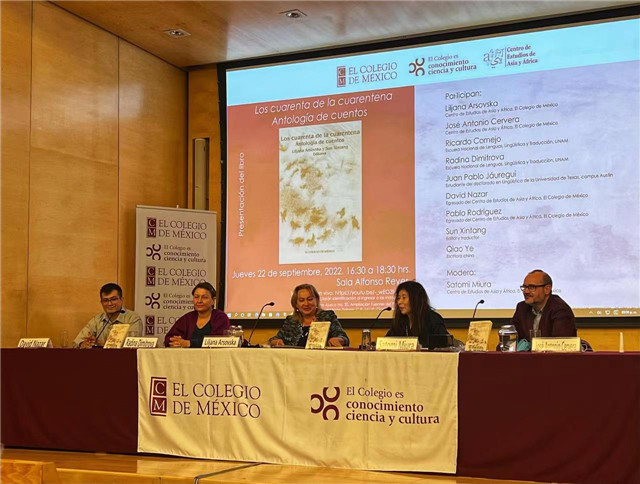 2022年是中國(guó)和墨西哥建交50周年。當(dāng)?shù)貢r(shí)間9月22日下午,由中國(guó)作家協(xié)會(huì)資助出版的《隔離期的閱讀——中國(guó)短篇小說(shuō)選》西班牙文版推介會(huì)以線上線下結(jié)合的方式在墨西哥學(xué)院阿方索·雷耶斯報(bào)告廳舉行。該書(shū)編者墨西哥學(xué)院亞非研究中心教授莉亞娜·阿索夫斯卡(Liljana Arsovska)、北京語(yǔ)言大學(xué)拉丁美洲研究中心主任孫新堂,譯者墨西哥學(xué)院亞非研究中心主任何塞·安東尼奧·塞維拉(José Antonio Cervera)、墨西哥國(guó)立自治大學(xué)副教授拉嫡娜(Radina Dimitrova)、墨西哥漢學(xué)家白佩蘭(Flora Botton)、羅豹鹿(Pablo Rodríguez Durán)、胡安·巴布羅·哈烏雷吉(Juan Pablo Jáuregui)、大衛(wèi)·納扎爾·庫(kù)蒂尼奧(David Nazar Couti?o)、羅杜安(Antonio Rodríguez Durán)以及中國(guó)作家喬葉等40余人參加活動(dòng)。墨西哥學(xué)院亞非研究中心學(xué)術(shù)主管三浦里美教授(Miura Satomi)主持推介會(huì)。