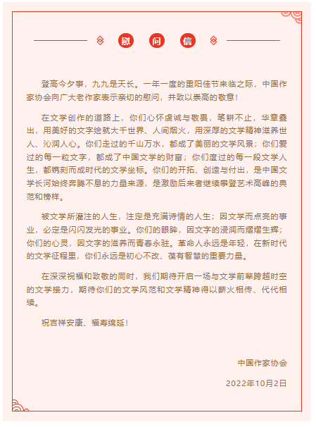為進一步弘揚中華民族孝親敬老傳統(tǒng)美德,關(guān)愛和致敬德高望重的前輩作家,營造敬老尊賢的良好風(fēng)氣和文學(xué)薪火代代相傳的良好氛圍,在一年一度的重陽佳節(jié)來臨之際,中國作家協(xié)會向全國廣大老作家發(fā)出重陽慰問信,并以委托團體會員單位走訪、致電等多種形式,集體慰問95歲以上的中國作協(xié)會員,向他們致以真誠的節(jié)日問候和崇高的敬意。中國作協(xié)黨組書記處同志陸續(xù)走訪慰問部分在京高齡作家。
