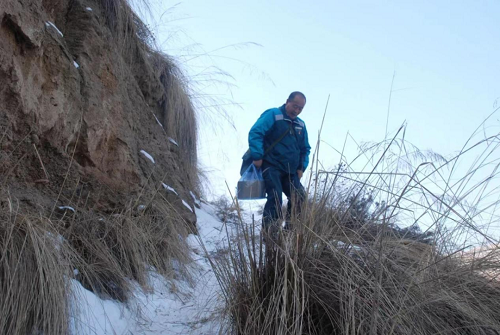 滿滿兩大包郵件,一左一右交叉背在肩上,身體剛好平衡,一個郵包15斤多,里面還有白天吃的干糧。唐和順遠遠低估了工作難度,這一天,在雪中,他爬高上低,跌跌絆絆,不知摔了多少跤,怕天黑送不完郵件,只能找捷道,而有些路只是鳥路,路滑,撿一根木棍,拄著走。肚子餓了,就著雪下饃饃。整個山野空無一人,千山鳥飛絕,就他一個雪人踽踽獨行,從天麻麻亮走到天黑。讓他倍感溫暖的是,推開一家門、進到一個學校,老鄉(xiāng)們送的一杯熱茶、一個熱雞蛋、幾句貼心的話讓他馬上忘了辛苦。晚上回到家,兩只腿像罐了鉛,泥糊了半褲子,吃了幾口飯,一翻身就上了炕。妻子見他這樣,說:“這么苦,就在家務農(nóng)吧?!碧坪晚樒骋谎燮拮樱罢l說苦了?”