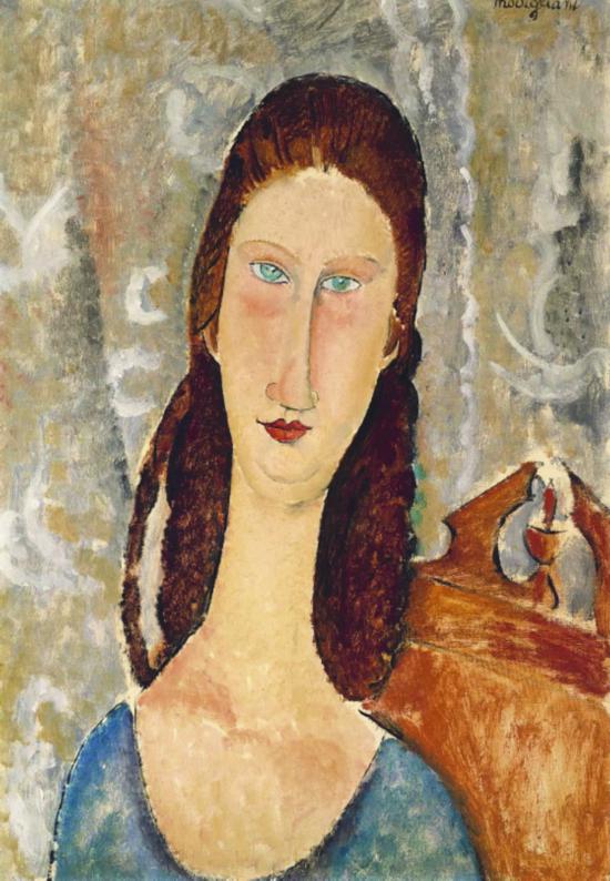 讓娜·艾布泰勒納1898年生于法國(guó)塞納-馬恩省的莫市,哥哥安德烈是個(gè)風(fēng)景畫家。在兄長(zhǎng)關(guān)懷下,她青年時(shí)期進(jìn)入位于巴黎蒙巴納斯大茅廬街的科拉羅西美術(shù)學(xué)院習(xí)畫,兼給日本雕塑家福吉塔當(dāng)模特兒,人們稱她為“椰子”。因?yàn)樗⊙┠w,一頭褐色秀發(fā)結(jié)成長(zhǎng)辮,身段苗條,婀娜生姿。據(jù)傳,意大利血統(tǒng)的畫家莫迪格里阿尼在大路上偶遇“妙曼如驚鴻,飄逸如神女”的讓娜,好像當(dāng)年但丁看見(jiàn)貝雅特里絲,彗星復(fù)現(xiàn)一般,立時(shí)屬意于這位杏眼女郎。1917年3月,經(jīng)由烏克蘭雕刻家夏納·奧爾洛夫介紹,二人在“赫桐德大酒店”邂逅,際會(huì)如期,雙方一見(jiàn)鐘情。另有一說(shuō)是,莫迪為女方的容貌所迷,覺(jué)得自己遇見(jiàn)了終生紅顏知己。他在一個(gè)假面舞會(huì)上,戴著“彼埃羅”面具向讓娜獻(xiàn)殷勤。其時(shí),讓娜尚未成年,但情竇初開,毫不遲疑地投入了莫迪的懷抱,跟他到大茅廬街八號(hào)陋舍同居。