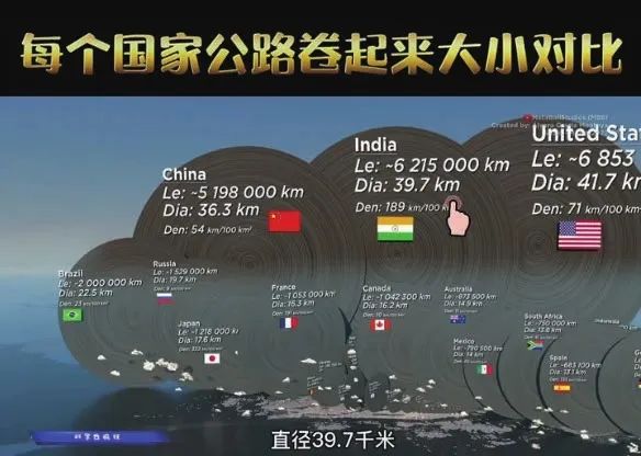 圖1《國家公路對(duì)比》形象地展示了各國公路網(wǎng)長度(圖片來自抖音視頻截圖)