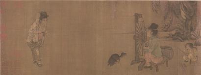 北宋王居正繪《紡車圖》表現(xiàn)農(nóng)家勞作紡紗的情形。圖繪一位老嫗弓腰駝背,站立紡線,通過兩條線與之連接的是畫面另一側的紡車,車右側有一女子一邊要紡車一邊懷抱嬰孩哺乳,其身后有一幼兒在戲蟾,還有一只黑狗在回首狂吠