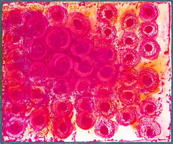 我嘗試了不同的風(fēng)格,也使用了不同的材質(zhì)、手法。這也是一個(gè)從混沌到清晰的過(guò)程。思想與材質(zhì)的碰撞,為觀念的分娩尋找到一個(gè)更有力、更和諧的外在呈現(xiàn)方式,這是一個(gè)野蠻生長(zhǎng)的過(guò)程。一次偶然,我把剩余顏料滴在畫(huà)布上,它慢慢滲開(kāi)形成一個(gè)并不標(biāo)準(zhǔn)的圓點(diǎn),圓點(diǎn)中間的材料又凝聚成一種好看的肌理。那一刻,像是水流瞬間穿過(guò)礁石帶來(lái)的澄明,像是暗沉的夜空星群閃爍帶來(lái)光芒。我想要的形式已經(jīng)顯形了,雖然它此時(shí)還是一個(gè)剛從母腹脫胎而出的嬰兒,但它初生的力量和圣潔已經(jīng)向我顯示了它的秩序與世界。