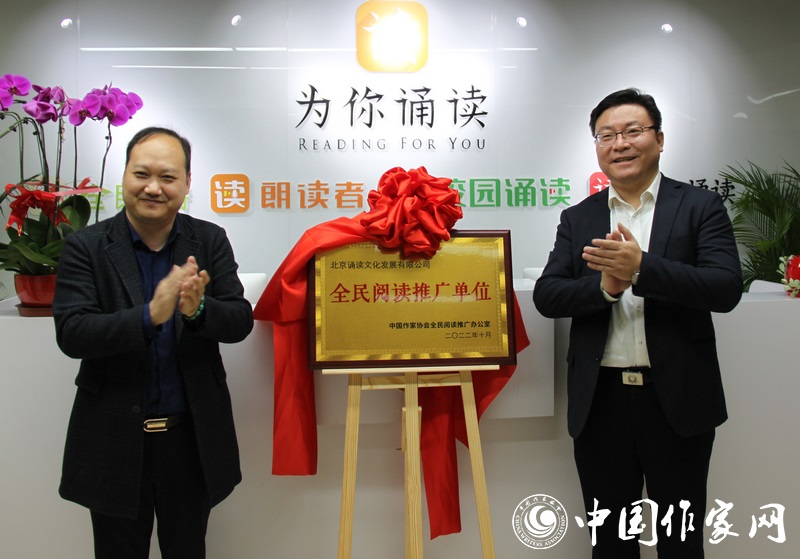 11月8日,中國作家協(xié)會全民閱讀推廣辦公室授權北京誦讀文化發(fā)展有限公司為“全民閱讀推廣單位”,授牌儀式在北京舉行。這是中國作家協(xié)會全民閱讀推廣辦公室授權的全國首家“全民閱讀推廣單位”。中國作家協(xié)會社會聯(lián)絡部主任李曉東、公共文學服務處處長劉戈、“為你誦讀”App創(chuàng)始人項建新等參加儀式。