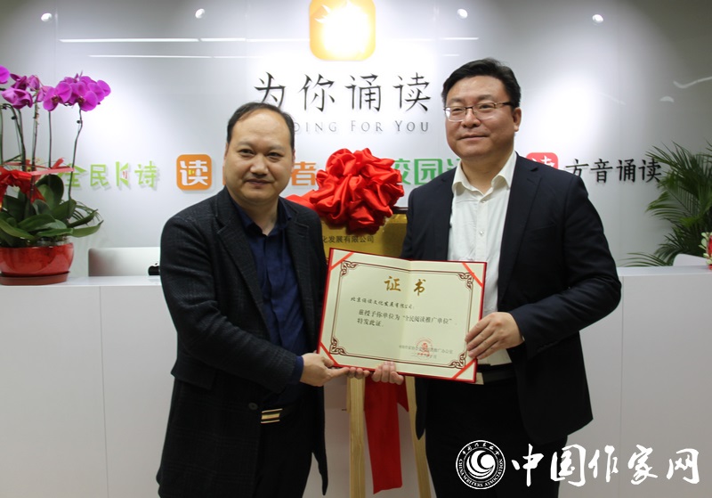 中國作協(xié)社聯(lián)部主任李曉東向“為你誦讀”App創(chuàng)始人項建新授予證書