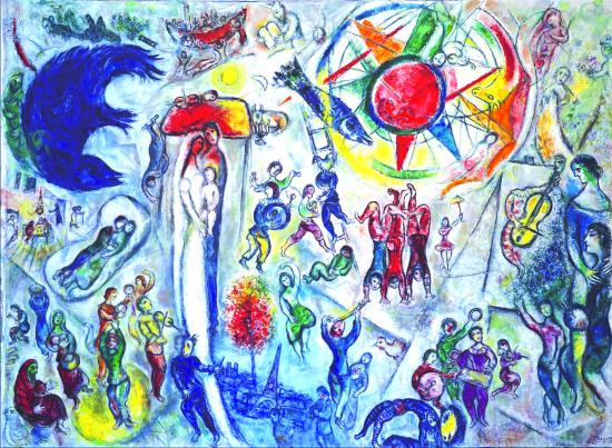 自1966年起直至1985年,夏加爾在法國普羅旺斯的圣保羅-德-旺斯鎮(zhèn)安家,創(chuàng)作了大量以當(dāng)?shù)匦沱惥爸聻樵慈囊耙莓嫞蔀榉▏摹拔邓{(lán)海岸派”畫家。他的畫作曾兩度在中國展出,得到中國觀眾的喜愛。早在1978年,筆者初次到巴黎就接觸到他的繪畫作品,看見街頭報亭里擺著他的曼妙畫幅《雅各的夢》和《埃菲爾鐵塔的新婚夫婦》,而后又在尼斯和艾克斯參觀了他的繪畫展覽。還值得提及,巴黎大歌劇院穹頂中心的彩繪天花板是馬爾羅于上世紀(jì)60年代初特邀請夏加爾設(shè)計的,上面畫有《火鳥》《天鵝湖》和《魔笛》等著名舞劇的圖像。他曾為《雅各的天梯》一畫配詩,作為給自己繪事生涯的歸結(jié):