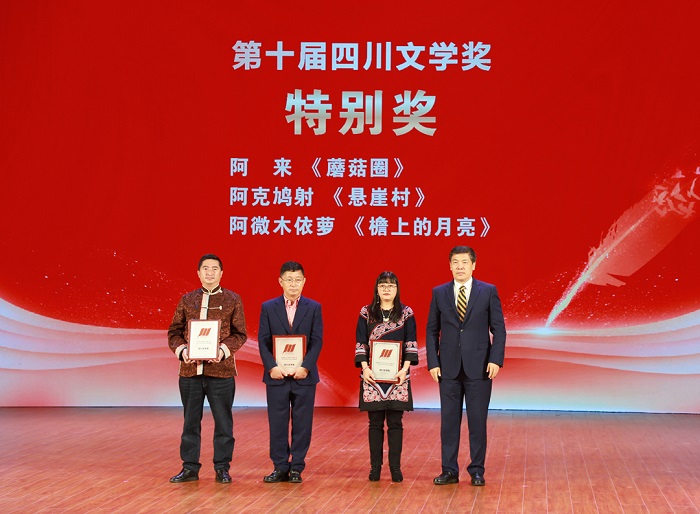 本屆四川文學(xué)獎(jiǎng)還設(shè)立了“特別獎(jiǎng)”。阿來(lái)的《蘑菇圈》、阿克鳩射的《懸崖村》、阿微木依蘿的《檐上的月亮》三部作品上榜。