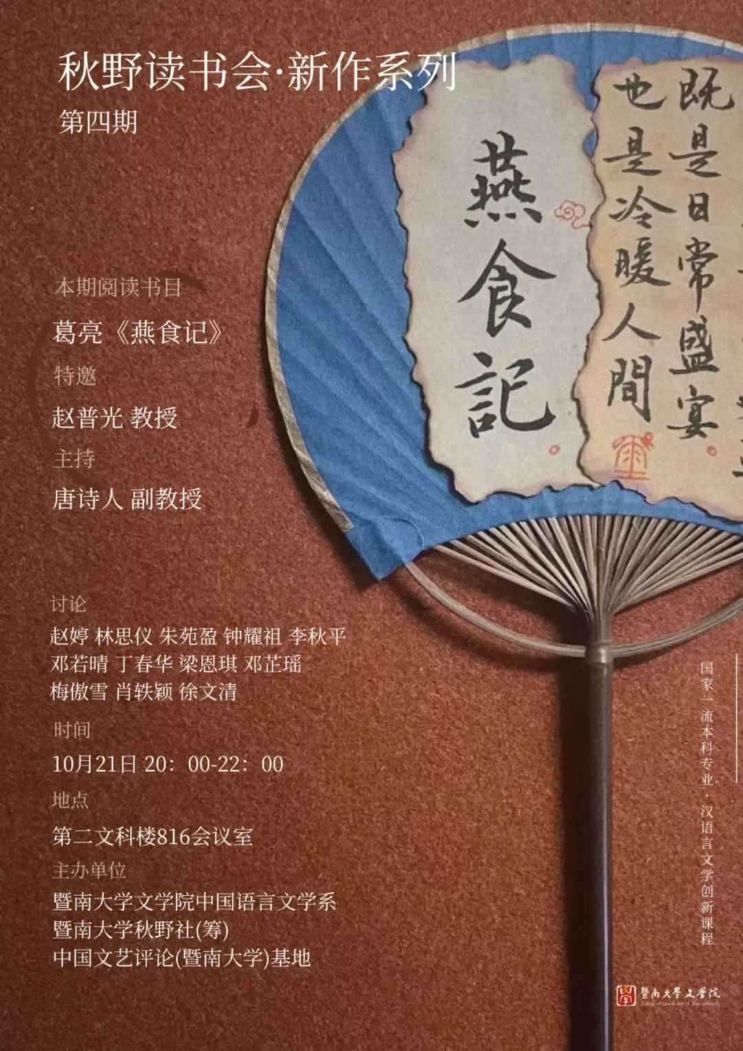 自2022年春季學期開始,暨南大學文學院中國語言文學系推出讀書會討論式教學創(chuàng)新課程。為紀念暨南大學校史上最具影響力的文藝社團“秋野社”,本課程取名為“秋野讀書會”,并分作經典閱讀和新作閱讀兩大系列。經典閱讀系列以課程形式春季學期兩周一次開展,新作系列以課外形式不定期舉行。