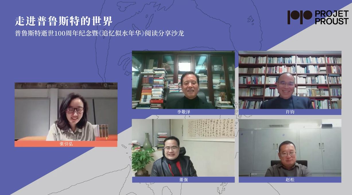 2022年11月18日普魯斯特逝世100周年紀念日之際,中信出版集團聯(lián)合上海圖書館、新京報·書評周刊、跳島FM,邀請翻譯家、學者、作家、評論家等,于11月15日至18日,以視頻直播和播客的形式,討論翻譯、閱讀普魯斯特的方法,理解普魯斯特這位20世紀最具獨特性的創(chuàng)作者和《追憶似水年華》的經(jīng)典意義。在15日的直播中,中國作協(xié)副主席、評論家、作家李敬澤,浙江大學文科資深教授、博士生導師、法語翻譯家許鈞,北京大學法語系教授、翻譯家董強以及作家、評論家趙松與讀者一同走進并追尋普魯斯特的世界,活動由中信出版·大方編輯張引弘主持。
