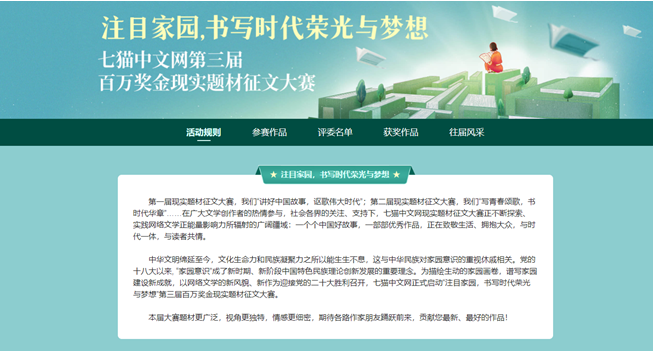 作為專注于原創(chuàng)文學(xué)培育與開發(fā)的內(nèi)容平臺(tái),七貓?jiān)谌涨矮@得“上海文化企業(yè)十強(qiáng)”榮譽(yù)。自成立以來(lái),七貓堅(jiān)持“鼓勵(lì)百花齊放,走精品路線”的內(nèi)容戰(zhàn)略,持續(xù)加大對(duì)現(xiàn)實(shí)題材作品的扶持力度,版權(quán)衍生開發(fā)作品走向更多讀者,鼓勵(lì)創(chuàng)作者著力現(xiàn)實(shí),做時(shí)代的記錄者和文化的創(chuàng)新者。2022年6月30日,七貓中文網(wǎng)第三屆現(xiàn)實(shí)題材征文大賽已經(jīng)啟動(dòng),以“注目家園,書寫時(shí)代榮光與夢(mèng)想”為主題,目前正在持續(xù)收稿中,以期挖掘更多描繪生動(dòng)的家園畫卷、譜寫家園建設(shè)新成就的中國(guó)好故事。