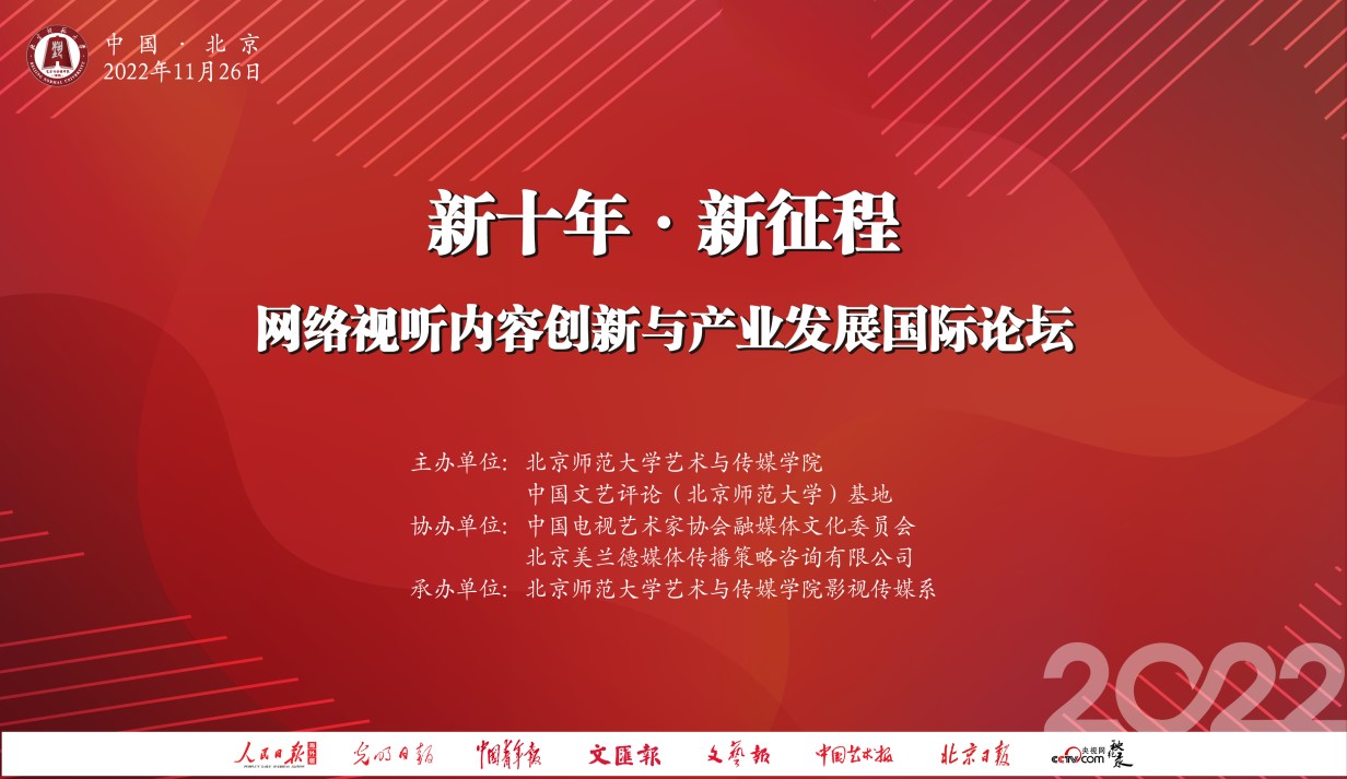 11月26日,由北京師范大學藝術(shù)與傳媒學院、中國文藝評論(北京師范大學)基地主辦,中國電視藝術(shù)家協(xié)會融媒體文化委員會、北京美蘭德媒體傳播策略咨詢有限公司協(xié)辦,北京師范大學藝術(shù)與傳媒學院影視傳媒系承辦的新十年·新征程 網(wǎng)絡(luò)視聽內(nèi)容創(chuàng)新與產(chǎn)業(yè)發(fā)展國際論壇在騰訊會議線上召開。此次論壇分為開幕式暨主論壇及網(wǎng)絡(luò)綜藝、網(wǎng)絡(luò)電影、網(wǎng)絡(luò)劇集、網(wǎng)絡(luò)紀錄片四場平行分論壇,云集36位國內(nèi)外學界、業(yè)界資深學者專家,共同探討網(wǎng)絡(luò)視聽內(nèi)容和產(chǎn)業(yè)高質(zhì)量發(fā)展的新路徑,為網(wǎng)絡(luò)視聽行業(yè)持續(xù)繁榮發(fā)展貢獻智慧與力量。