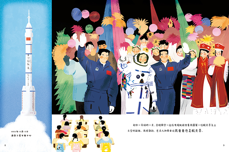 中國作家網(wǎng):您和鄧清明的女兒鄧滿琪同為90后,在創(chuàng)作繪本時一定很有代入感吧!能談?wù)勀敃r的創(chuàng)作心態(tài)嗎?另外兩本父親系列的繪本里,父親最后都實現(xiàn)了自己的夢想,而《爸爸的秘密》的結(jié)尾則是開放式的。如今鄧清明航天員已經(jīng)圓夢,您一定有很多感慨吧!能分享一下嗎?