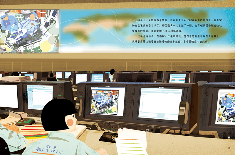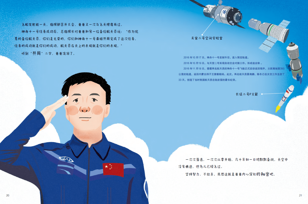 趙墨染:2016年我在清華美院讀書的時候選擇做科普繪本的研究,有了一些科普繪本的創(chuàng)作經(jīng)驗。2018年中國少年兒童新聞出版總社的唐威麗老師聯(lián)系到我說有這樣一個航天員的故事,問我感不感興趣。本身我對航天題材也很感興趣,看了鄧清明父女《朗讀者》的節(jié)目后,被深深地打動了。之后在出版社的安排下我和鄧清明的女兒滿琪見面了,自此開始了我們?nèi)甑膭?chuàng)作之旅。這三年我們線上線下溝通了多次,她給我提供了非常詳盡的資料。比如故事的腳本,相關(guān)的影像資料,參考書籍、電影和紀錄片等等。從文字到分鏡圖再到正稿,滿琪很認真地校對每一處。因為她作為航天人的專業(yè)背景,有她在我會很踏實。說到印象最深的瞬間是神舟十一號任務(wù)準備階段,滿琪在指揮大廳值班看到爸爸出現(xiàn)在大屏上,她眼含淚水的樣子讓我難忘。