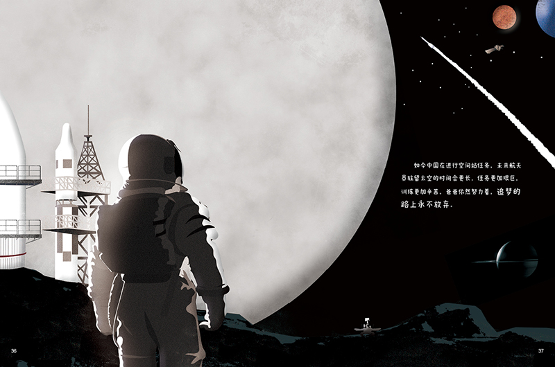 趙墨染:科普類型的繪本創(chuàng)作更需要大量的資料研究和科學求真的精神。盡可能多看資料,多去實地考察。就怕創(chuàng)作時需要畫,卻沒有素材可參考。要在有限的體量內(nèi),講清楚想表達的故事,對資料的分類整理必不可少。如何將這些素材編輯好,講好這個故事也是研究重點。比如一開始做《爸爸的秘密》這本書,書中涉及航天專業(yè)知識的圖形化對我來說確實是個難關(guān),但隨著創(chuàng)作的深入,資料收集越來越充分時,我開竅了,也得心應(yīng)手起來。關(guān)于航天員訓練、中國航天大事記、航天器等畫面我運用了視覺傳達設(shè)計中的信息圖表的方法,按照時間線分類以及做兒童喜歡的圖形化的設(shè)計,在排版上注意圖文的關(guān)系,讓讀者更清晰地了解這些科普知識??偨Y(jié)而言是對內(nèi)容的理性梳理和感性呈現(xiàn)。
