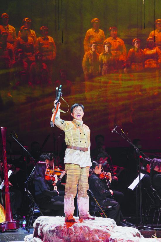 當然,一部優(yōu)秀的舞臺作品離不開藝術家的二度創(chuàng)作。男高音歌唱家王宏偉從軍30余年,有不少家喻戶曉的代表作,塑造過一個個生動鮮活的人物形象。黃繼光在他的演繹之下亦別具魅力。從音樂表現來看,王宏偉以清亮高亢的嗓音將人物的唱段詮釋得淋漓盡致。《抬頭仰望夜黑的天》是黃繼光與戰(zhàn)友失散后于山林間的一段內心獨白,抬頭仰望夜空,他想起家中年邁的母親,想起祖國親人的囑托,情緒從茫茫無依到想起歸宿,風格從極致浪漫到堅定激昂,王宏偉通過這段演唱將人物內心情緒的轉變詮釋得立體飽滿。戰(zhàn)斗打響之前,黃繼光一段《等我把立功喜報寄回家》的演唱,纏綿中帶著激昂,慷慨中繞著思念,將親情、戰(zhàn)友情和思念祖國的鄉(xiāng)情三位一體地展現了出來。