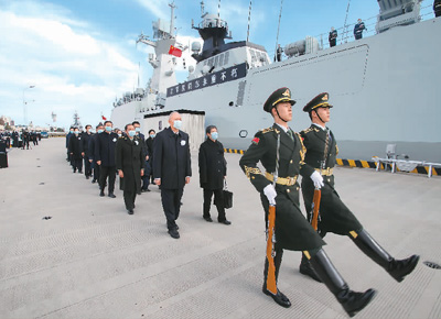 中國人民解放軍海軍揚州艦伏波靜臥,艦上官兵分區(qū)列隊、肅立舷邊。揚州是江澤民同志的故鄉(xiāng)。今天,這艘以揚州命名的軍艦,以最高禮儀送別這位為黨和人民建立了不朽功勛的卓越領(lǐng)導(dǎo)人。江澤民同志的親屬捧護著骨灰登上揚州艦。海軍笛吹響,儀仗隊持槍肅立,行注目禮。當揚州艦起航時,軍港內(nèi)所有艦船汽笛長鳴,響徹云霄。