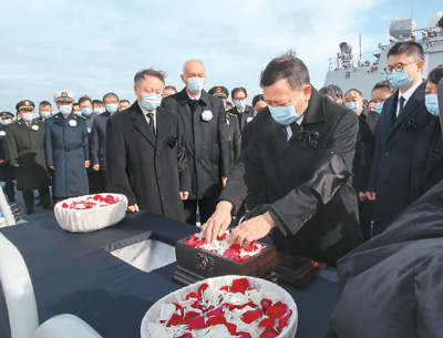十二月十一日,遵照江澤民同志及其親屬的意愿,敬愛的江澤民同志的骨灰在長江入海口撒入大海。受黨中央委托,中共中央政治局常委、中央書記處書記蔡奇等領(lǐng)導(dǎo)同志和江澤民同志的夫人王冶坪等親屬護送骨灰撒放。新華社記者 李 濤攝
