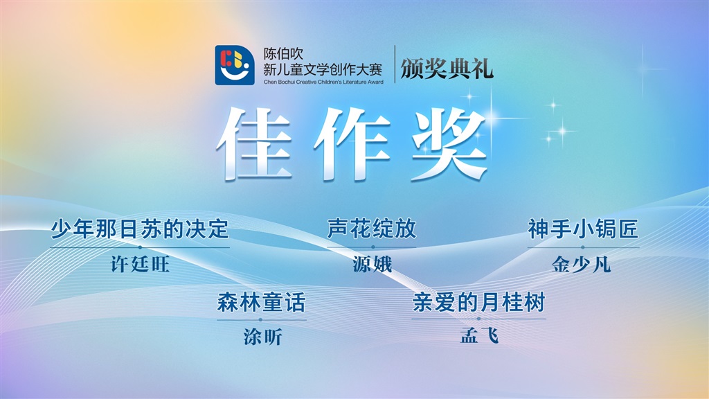 12月16日,首屆陳伯吹新兒童文學(xué)創(chuàng)作大賽頒獎典禮暨上海譯文童書中心成立五周年紀(jì)念活動在世紀(jì)出版園舉行?!渡倌昴侨仗K的決定》《聲花綻放》《神手小鋦匠》《森林童話》《親愛的月桂樹》獲得“陳伯吹新兒童文學(xué)創(chuàng)作大賽佳作獎”,《會跳舞的狼》《你是水晶、冬天、葡萄和鳥》《飛上云端的足球》獲得“陳伯吹新兒童文學(xué)創(chuàng)作大賽桂冠獎”。