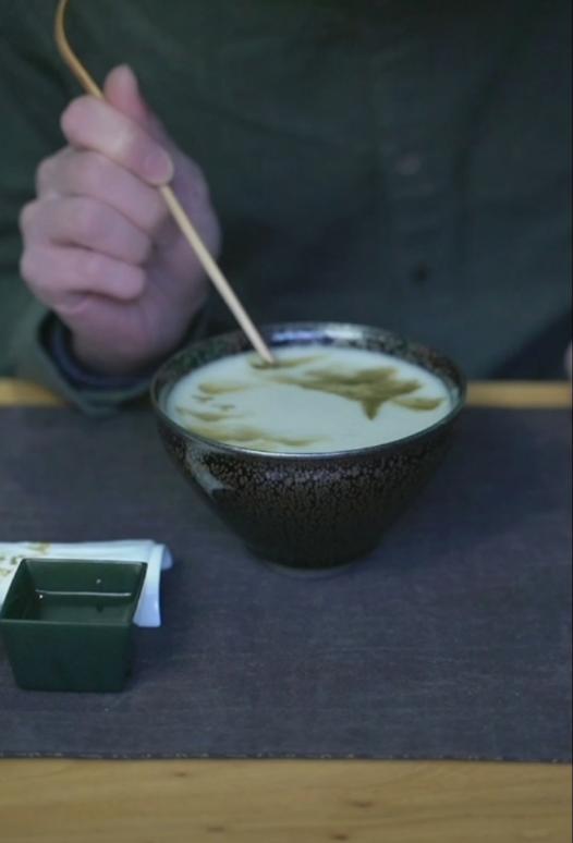 “無(wú)由持一碗,寄與愛(ài)茶人。”茶百戲表演中,粗筆勾勒,工筆細(xì)描,一幅寫(xiě)意山水畫(huà)就出現(xiàn)在建盞之上。兔毫釉面襯得茶沫綿密細(xì)膩,抹茶粉末畫(huà)就的山水意境悠遠(yuǎn),傳承了千年的品茗意趣就這么生動(dòng)地展現(xiàn)在眾人面前,就如同茶日歷里收錄的宋代飲茶圖一般,令人心向往之。