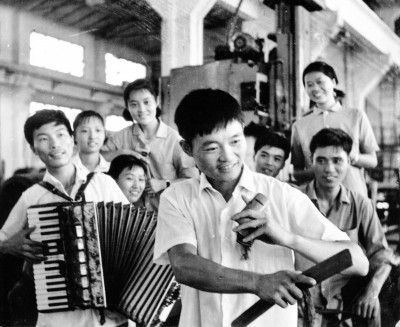 年輕的水運(yùn)憲隨廠宣傳隊送節(jié)目下車間時表演自編的快板書。常德電機(jī)制造總廠,湖南德山,約1970年。圖片由受訪者提供