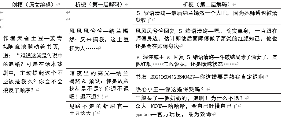 如上所述,從文學(xué)接受或批評角度來看,傳統(tǒng)的讀者轉(zhuǎn)變?yōu)?“ 閱評家”;從文化工業(yè)的角度來說,印刷媒介時代的讀者成為數(shù)字媒介時代的 “ 產(chǎn)消者”。當(dāng)我們從文學(xué)傳播的視角觀察讀者(受眾)時,發(fā)現(xiàn)這一形象的內(nèi)涵也有很大的變化。在一些傳統(tǒng)傳播學(xué)家看來,受眾是被動、無知和毫無意義的 “ 烏合之眾” 或 “ 群氓”。法蘭克福學(xué)派的代表人物馬爾庫塞也認(rèn)為文化工業(yè)在社會的控制、同質(zhì)化過程中,使得讀者大眾變?yōu)?“ 單向度的人”。的確,由于傳統(tǒng)媒介的封閉性,作家是信息發(fā)出的起點,讀者是信息接受的終點,創(chuàng)作和閱讀一定程度上遵循著行為主義心理學(xué)的 “ 刺激/反應(yīng)” 模式。但正如傳播學(xué)家丹尼斯·麥奎爾所說:“ 隨著以電腦科技為基礎(chǔ)的媒介技術(shù)的發(fā)展,各種 媒介的互動能力在不斷增強,由單向系統(tǒng)變?yōu)殡p向系統(tǒng)······媒介使用者能夠取得對信息環(huán)境的控制?!盵25] 這種控制在讀者身上也有突出表現(xiàn),他們既是信息的接受者,也是信息反饋者、發(fā)出者,很多時候能夠承擔(dān)起廣告商、記者的職能,“ 刺激/反應(yīng)” 模式轉(zhuǎn)變?yōu)?“ 編碼/解碼” 模式。因而在從傳受分離到傳受合一的過程中,傳統(tǒng)的受眾就有了一個更恰當(dāng)?shù)拿Q— “ 傳受人”。傳受人的行為在網(wǎng)絡(luò)文學(xué)的 “ 玩梗” 敘事中有著清晰呈現(xiàn)。所謂 “ ?!?,常被看作可以反復(fù)引用或演繹的經(jīng)典橋段、典故或笑料,被認(rèn)作是 “ 哏” 的誤用。[26]下面就以網(wǎng)絡(luò)文學(xué)白金作家 “ 天蠶土豆” 新作《萬相之王》的 “ 退婚梗”[27]為例,解讀傳受人的接受/傳播行為: