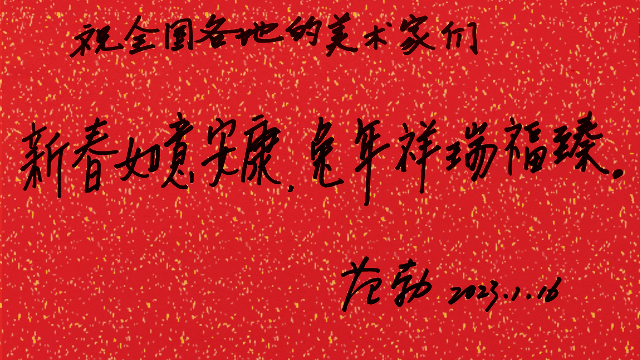 中國(guó)文聯(lián)副主席、中國(guó)美協(xié)副主席許江賀詞:恭賀新年!寅虎默默伏山崗,卯兔莘莘出景陽(yáng)。 祝中國(guó)美術(shù)二零二三碩果累累。