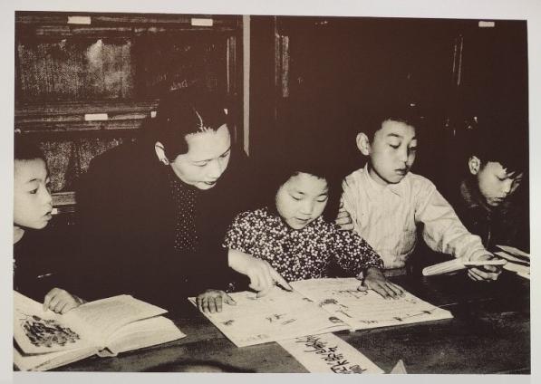 宋慶齡在膠州路第一兒童福利站內(nèi)指導(dǎo)孩子們讀書。