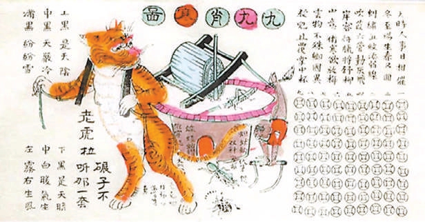 銅錢型消寒圖流傳在民間,式樣也變得更加多樣,人們往往會在一連串銅錢邊上添上一些圖畫,寫上幾句風(fēng)趣之語,讓隆冬的生活變得“有說有笑”。比如河北武強(qiáng)年畫《九九消寒圖》,畫面右側(cè)是八十一個(gè)銅錢圖樣,中部畫著一個(gè)“老虎拉碾子”的形象,還有一句歇后語“老虎拉碾子——不聽那一套”。右上側(cè)則寫有唐代杜甫的詩歌《小至》:“天時(shí)人事日相催,冬至陽生春又來。刺繡五紋添弱線,吹葭六管動浮灰。岸容待臘將舒柳,山意沖寒欲放梅。云物不殊鄉(xiāng)國異,教兒且覆掌中杯?!?/p>