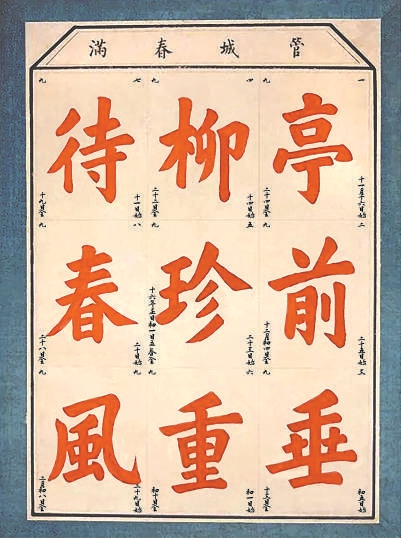 游戲者每日用紅色或彩色筆描填一筆,九個(gè)字填滿正是冬盡春來之時(shí)。最流行的九個(gè)字是“亭前垂柳珍重待春風(fēng)”,此外還有“春前庭柏風(fēng)送香盈室”“故城秋荒屏欄秋枯榮”“雁南飛柳芽香便是春”“待柬春風(fēng)重染郊亭柳”“庭前春幽挾草巷重茵”“亭前屋后看勁柏峰骨”等等,以上每句的九個(gè)字的繁體都合九之?dāng)?shù),現(xiàn)代人也創(chuàng)作了簡體筆畫合乎九的句子,如“幽柏姿美濃蔭待春榮”。各句文字雖然不同,表達(dá)的都是盼春、迎春之意。