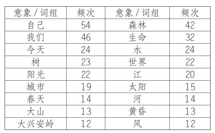 通過對(duì)詩(shī)集意象進(jìn)行梳理(見圖1),筆者發(fā)現(xiàn)“森林”在《極地漫步》中出現(xiàn)42次?!吧帧碧刂浮按笈d安嶺”,“大興安嶺”則在詩(shī)集中出現(xiàn)12次。詩(shī)人魯微在與“森林”對(duì)話時(shí),將“森林”賦予詩(shī)性、神性意味?!吧帧?,不是人類索取資源等物質(zhì)財(cái)富的寶庫(kù),而是植物動(dòng)物等生命安居的家園,代表著詩(shī)人的某種信仰。它超越了沉重的感情,超越了烏托邦意識(shí)。這種對(duì)“森林”的情感化為彌漫在詩(shī)歌中的“森林意識(shí)”。在詩(shī)人魯微的筆下,“森林”的背后不單單是構(gòu)成森林的生物,它不單是題材和背景,還形成了魯微獨(dú)特的創(chuàng)作個(gè)性。