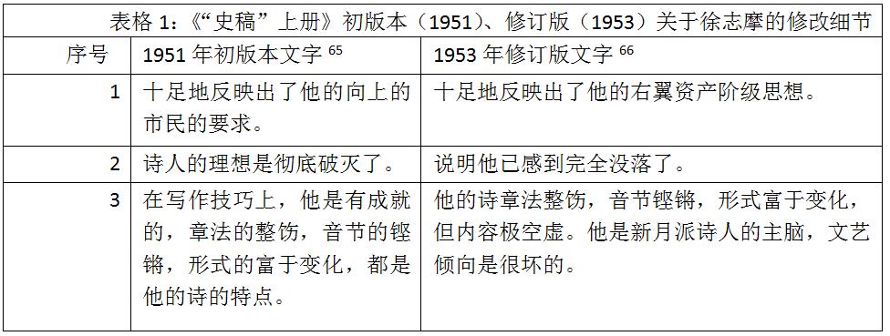 表面上看,王瑤并沒有真正做到傷筋動骨地對有關“新月派”前期文字加以處理,特別是對聞一多、朱湘、饒孟侃,但對盟主徐志摩的文字,的確進行了“有限度”的處理,列表中從“向上的市民的要求”轉變?yōu)椤坝乙碣Y產階級思想”的文字陳述,這從政治性質上對徐志摩進行了否定,從中可看出王瑤在思想主導上從初稿的“統(tǒng)一戰(zhàn)線”思維轉變?yōu)椤半A級斗爭”思維67。而“沒落”一詞來描述徐志摩的走向,標志著撰者對這位代表性詩人的詩歌理想的徹底否定。具體在藝術成就的評價上,初版本立足于徐志摩詩歌的藝術成就,指出他在寫作技巧上是“有成就的”,作出肯定性評價,帶有推崇的意味,但修訂版中增加的文字,首先從內容上否定徐志摩的詩歌,認為其內容“極空虛”,其次還以“他是新月派詩人的主腦,文藝傾向是很壞的”加以否定。