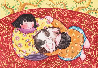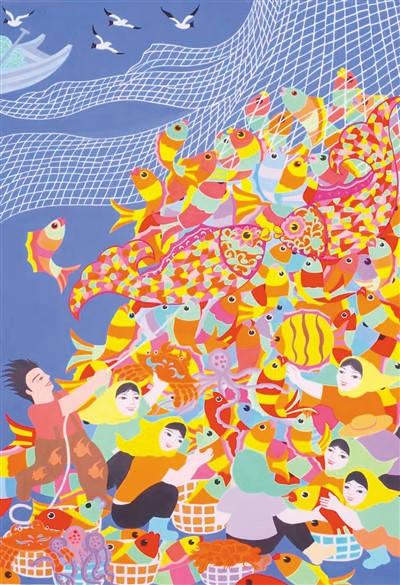 新年畫之新,不僅在主題內(nèi)容之新,也在于創(chuàng)意構(gòu)思的新穎、藝術(shù)表現(xiàn)手法的推陳出新。一些表現(xiàn)傳統(tǒng)主題的年畫作品,同樣讓人眼前一亮,呈現(xiàn)出鮮明的時代特征。今年的新作中有不少以生肖兔作為主題,比如《瑞兔呈祥》筆觸細膩,采用了裝飾藝術(shù)簡潔的表現(xiàn)形式,營造出空間感;《年年歲歲》在黃、橙、紅三色的喜慶基調(diào)中,中間添加人物手拿糖葫蘆,仿佛是喜慶年節(jié)的一次奇妙之旅,讓傳統(tǒng)抵達今天;《新生》則以迎接兔年為背景,描繪了一對母子在自然的美景中迎接一窩新生小兔的場景,畫中人物采取插畫的表現(xiàn)手法,人物和兔子都各自以圓形的輪廓進行強化,傳遞出春節(jié)的團圓氛圍和暖意融融。豐收一直是年畫的重要表現(xiàn)主題之一,豐收主題亦在今年的新作中占有相當?shù)谋戎亍1热缇哂酗@著江南水鄉(xiāng)風格的《我們的小康生活》,采用工整細致的表現(xiàn)技法,細膩地描繪了江南古鎮(zhèn)的民居,以當?shù)厝讼矏鄣奈瑾{、舞龍、擊鼓、玩船等喜聞樂見的形式慶祝豐收,以紅色調(diào)來表達人們喜悅的心情,紅火、熱情、喜悅,讓觀者可感可知。又如表現(xiàn)時令節(jié)氣主題的作品《春風》,以獨特的俯視視角,從天空中飛舞的3只具有中國傳統(tǒng)美好寓意的風箏,俯瞰在廣場上沐浴春風的老老少少,洋溢著春天的活力與希望。