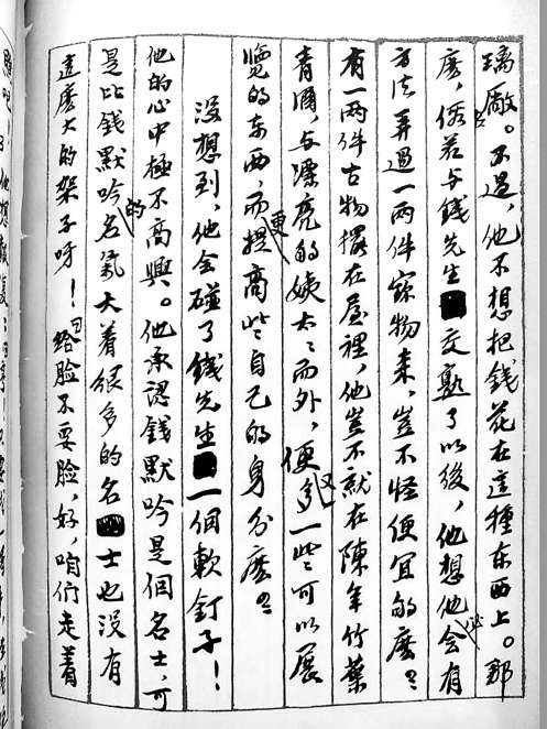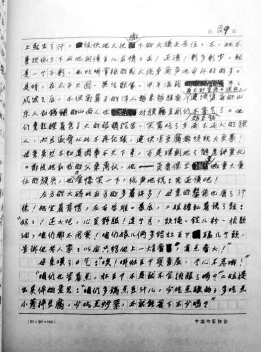 翻開(kāi)老舍的手稿,確實(shí)可以看到如舒乙所述,它始終是作者自己的手跡(一些話劇劇本曾請(qǐng)秘書(shū)幫抄過(guò)),就是那么一直到底嚴(yán)守500字小綠格,端端正正、規(guī)規(guī)矩矩,一字一字地寫(xiě)下來(lái)。遇有修改的地方,舊的,用鋼筆水嚴(yán)嚴(yán)實(shí)實(shí)地涂掉(讓你無(wú)法辨識(shí)出原來(lái)是什么字),然后再十分專業(yè)地勾線,在空白處寫(xiě)上改后的文字。對(duì)于作者手稿后期工作的出版環(huán)節(jié),編輯人員,排錄人員,校對(duì)人員,面對(duì)這樣的稿子都是一件幸事。舒乙說(shuō)《正紅旗下》手稿整齊干凈而漂亮,是手稿中的上品、藝術(shù)品、珍藏品,這是“觀千劍而識(shí)器”的內(nèi)行之論。說(shuō)實(shí)在的,不真?zhèn)€地親自翻一下這件手稿,您對(duì)這些評(píng)述的感覺(jué)總還是不落實(shí),虛浮想象。