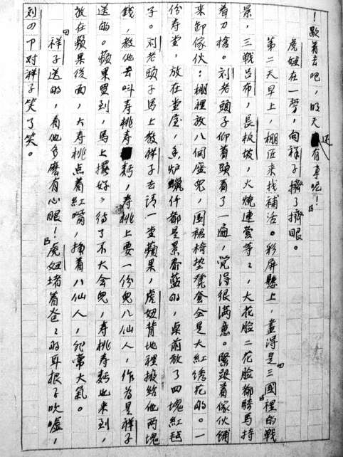 還有一點(diǎn),老舍在原稿上的修琢,也并非只限于個(gè)別字句——他還成行連片甚至是成段落地“推倒重來(lái)”呢。他的辦法是沿著魯迅、周作人“精工細(xì)作”的這一路而重來(lái)的:把“推倒”那一片先橫格豎行數(shù)清楚,在另一張空白稿紙上照著剪下一塊,然后重書(shū)改文,再小心翼翼將“補(bǔ)丁”貼回到原行原格的位置,橫水平,豎齊線,不仔細(xì)盯著看,你幾乎發(fā)現(xiàn)不了這塊“整容”!《正紅旗下》手稿164頁(yè),從前到后粗檢一遍,我至少數(shù)出了作者有七處這樣剪貼的痕跡。這是什么精神?是作者莊重地對(duì)待自己的作品,鄭重地呈給將來(lái)的讀者,這樣一種嚴(yán)以責(zé)己、敬以奉世的精神。稍再思之,我們的古來(lái)先賢,類似如是地留給人世間精美藝術(shù)品般的手稿,不是屢屢可見(jiàn)的嗎?