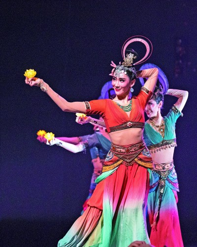 《錦繡》描述的場(chǎng)景是,上元節(jié)燈火鋪滿天空,舞者身著漢式長(zhǎng)裙,步伐輕緩蹁躚,在織錦的經(jīng)緯線上起舞,“五星出東方利中國(guó)”織錦護(hù)臂逐漸呈現(xiàn)在眼前,漢唐味十足;《遠(yuǎn)古的呼喚》展現(xiàn)的景象則是,在精絕城首領(lǐng)款待賓客的夜宴上,舞者們身著華美服飾,手持蓮花燈翩翩起舞,仿佛龜茲壁畫中的仙子下凡,西域風(fēng)很濃。