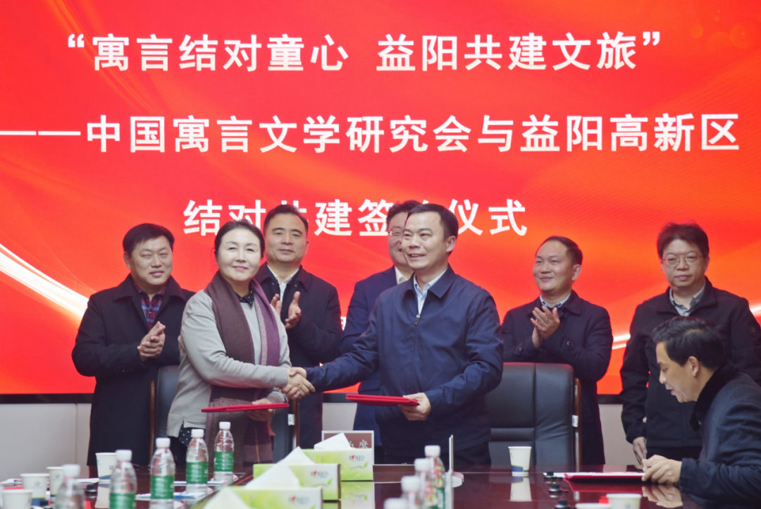 會后,還舉行了“寓言結對童心 益陽共建文旅”中國寓言文學研究會與益陽高新區(qū)結對共建簽約儀式。肖驚鴻、喻理科分別代表雙方正式簽約,劉益希主持簽約儀式,李曉東、汪軍、劉戈、謝樂軍、包后勇等共同上臺見證。雙方將積極推進多項合作,開設文學專題講座、建設中國寓言文學研究會兒童書屋、深入文學調研走訪、開展寓言童話進校園活動、舉辦全國兒童文學類頒獎或賽事等,助力清溪村開創(chuàng)更具辨識度的新文化,努力將中國寓言以更為豐富、嶄新的形式呈現(xiàn)在大眾面前。