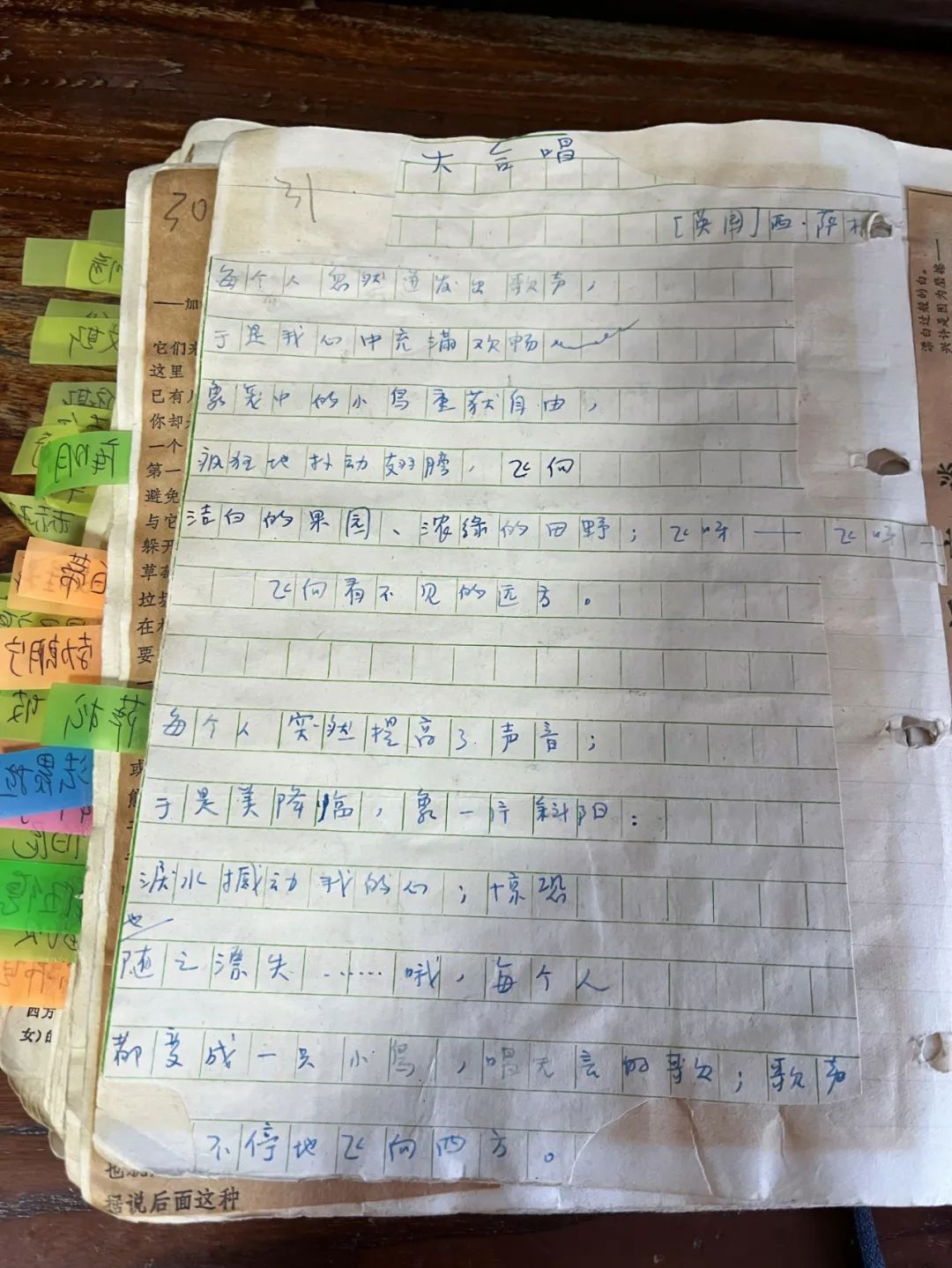 我守著他留下的這十幾本日記,還有他不少未出版過的從很年輕時陸陸續(xù)續(xù)星星點(diǎn)點(diǎn)譯出的自己喜歡的詩。幾十年的老本子,他親手剪報粘貼整理的詩集譯稿,我捧在手中,淚水不小心滴在上面。