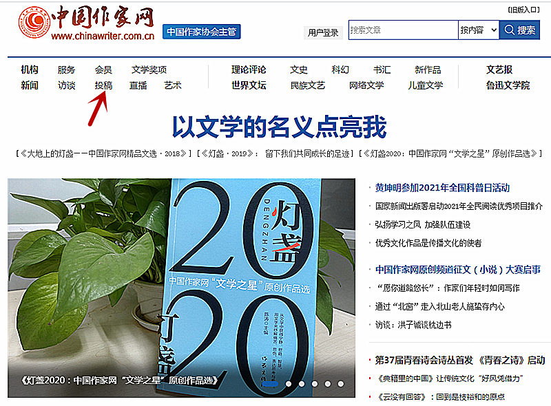 1、首先登錄中國作家網(wǎng)http://m.jpg-valve.com/ 在首頁頂端頻道分類位置找到“投稿”(標紅色箭頭處),點擊進入原創(chuàng)頻道。