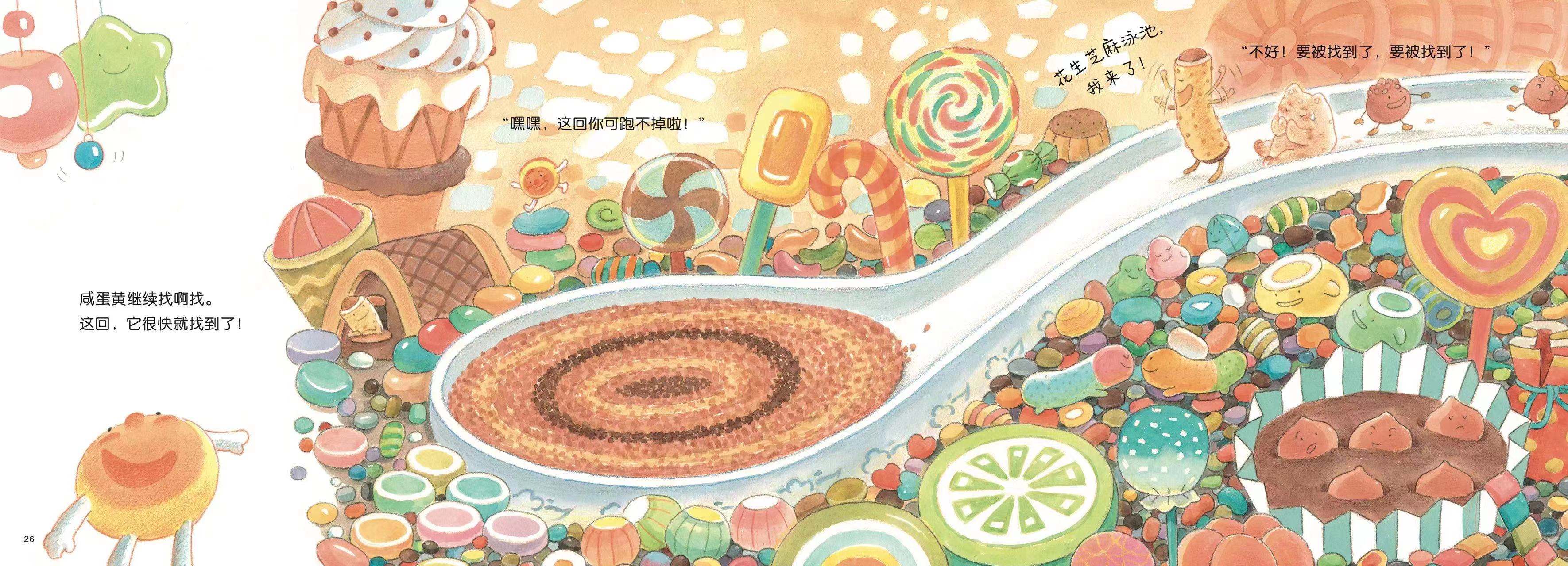 糯米團裹上粽葉……就換了一個名字,這樣就不會被找到了!要是和別的食物在一起呢……想著想著,一個思路就成型了,用捉迷藏的線索把各種食物串在一起,就變成一個關于糯米團的故事。