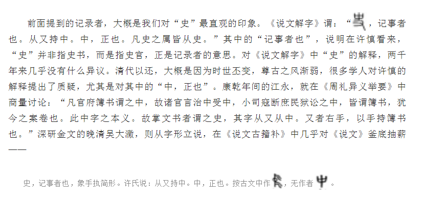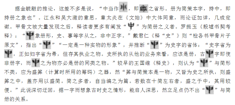 這個崩潰和重建的過程,傳統(tǒng)經(jīng)典系統(tǒng)的圈定范圍桶底脫落,精心述作過的有周一代文化不再是唯一選擇,原先被經(jīng)典封存的能量持續(xù)涌出,此前不夠雅馴的文化就此有了新的意義。對“史”字的解釋,便也逐漸離開了此前的“記事者也”范圍,向具體事務(wù)和神明祭祀兩個方向擴展。1960年代,屈萬里在審閱一篇文章時表示:“史字上半所從之□(按,‘之’后有一空格,疑有脫字,似應(yīng)為‘圖片’上之‘圖片’),絕非簡冊之形。因冊字習(xí)見于甲骨文及金文,絕無作圖片者(甲骨文往往以‘史’為‘事’)?!?980年代初,胡淀咸的《釋史》一文,考察多種甲骨和金文,確立了史與事之間的關(guān)系:“‘史’和‘事’,原就是一個字。所謂史官實是任事之官,史、御史、大史、卿史都是由它所執(zhí)掌的事務(wù)而得名的?!睆倪@個方向看,史與事的貫通,正是高層文化跟具體事務(wù)的溝通——或許在起始的時候,史官就并非一直高居廟堂,秉持著抽象的中正之德,目光如炬,執(zhí)簡運筆——那些經(jīng)典系統(tǒng)中致力于精神層面的人,在更深的意義上,一直就沒有脫離基礎(chǔ)性的勞作與時日。