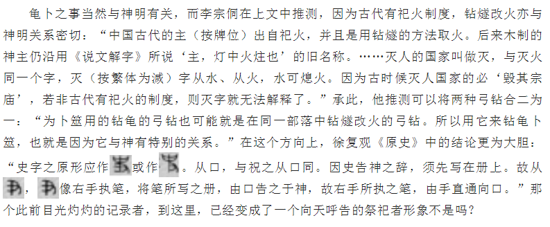 不止庶事,仔細推敲起來,恐怕連神明祭祀之事,也無法離開具體的勞作。勞榦大概就是發(fā)現(xiàn)了其間的關(guān)聯(lián),在《史字的結(jié)構(gòu)及史官的原始職務(wù)》中,他便認定史的起源與弓鉆有關(guān):“在史字中其所從的圖片就是一個弓背向下的弓形,金文及甲骨凡從弓的字,弓都是對側(cè)面的,這都是射箭的弓,只有這個弓形的弓背向下,對于弓鉆的形狀,正皆符合。”手持弓鉆的史,主要是鉆燧改火和攻治龜甲。鉆燧不消說需要弓鉆,攻治龜甲其實也在所難免:“龜甲是比較堅硬的,為求得卜兆先要在預(yù)備灼火之處,把它刮薄,因為硬難以刮薄,因此便先鉆,然后在鉆處再用鑿擴大。”如此手上有具體之事的史,當(dāng)然不會跟抽象的中正無關(guān)。王國維《釋史》云,“中正,無形之物德,非可手持”。李宗侗《史官制度——附論對傳統(tǒng)之尊重》承接此義,分析鞭辟入里:“中正是表示無形的物件;而最初的人所表示的物品多半是有形的。所以不可能以手持無形的物,這是不合于古人的思想的?!?/p>